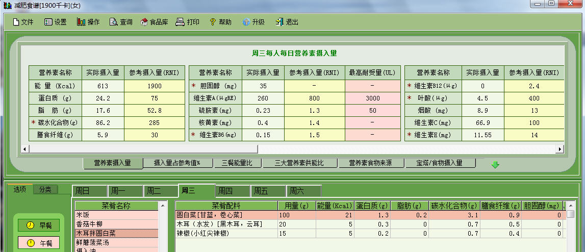 在显示区有六个显示标签:营养素摄入量、摄入量占参考值%、三餐能量比、三大营养素供能比、营养素食物来源、宝塔/食物摄入量,下图: