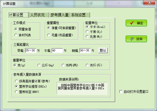 计算设置分四个部分内容,如上图:基本的“计算设置”、“人员状况”设置、“参考摄入量”设置、“系统设置”。点击四个设置标签,分别在里面点击设置选项,完成设置后,点击设置窗口右边的“确定”按钮。
