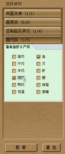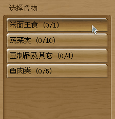 食物的选择共有四项:米面主食、蔬菜类、豆制品及其它、鱼肉类。如下图: