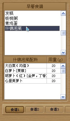 每餐食谱都由上下两个列表框组成,如上图:上面的框中是菜肴名称,下面框中是对应的菜肴配料。