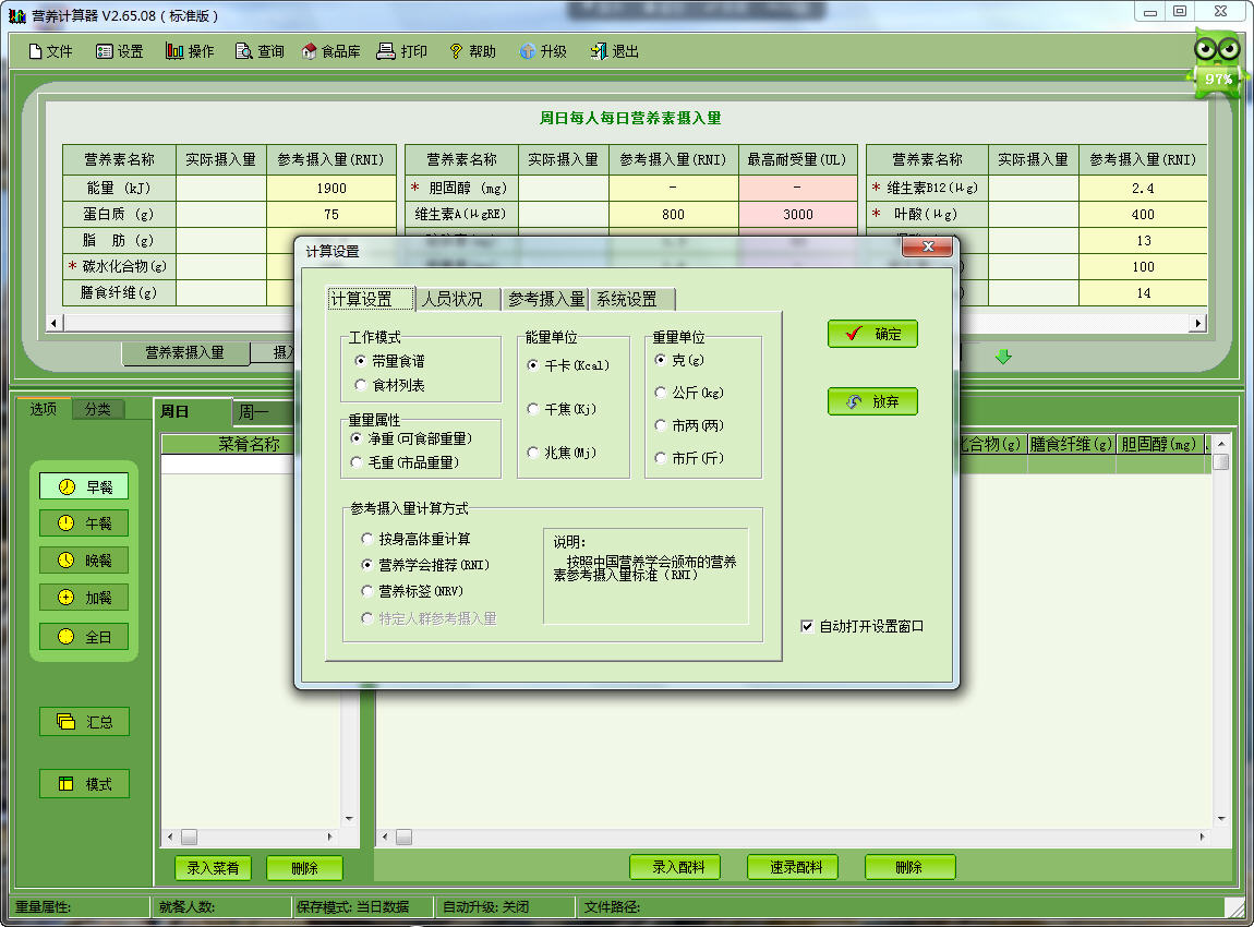 在上面的默认设置会出现如下主窗口,在这个窗口中,可以立即录入食物了。这部分操作是软件的重点,学会录入菜肴了,软件也就基本会使用了。