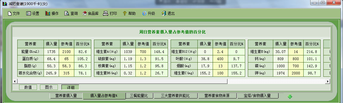 在显示区有六个显示标签:营养素摄入量、摄入量占参考值%、三餐能量比、三大营养素供能比、营养素食物来源、宝塔/食物摄入量,下图: