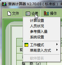 计算设置分四个部分内容,如上图:基本的“计算设置”、“人员状况”设置、“参考摄入量”设置、“系统设置”。点击四个设置标签,分别在里面点击设置选项,完成设置后,点击设置窗口右边的“确定”按钮。