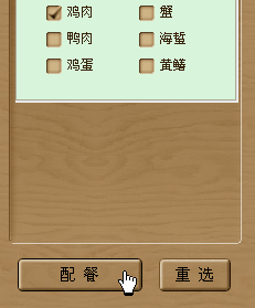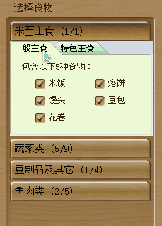 食物的选择共有四项:米面主食、蔬菜类、豆制品及其它、鱼肉类。如下图: