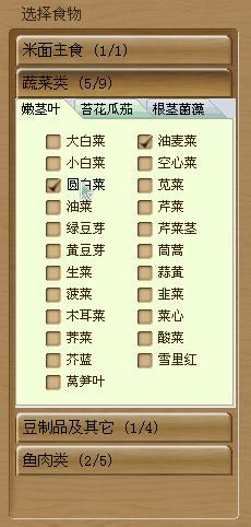 再看看怎样选择蔬菜类食物。在上图中点击“蔬菜类”,然后就打开可选择的蔬菜名称,下图: