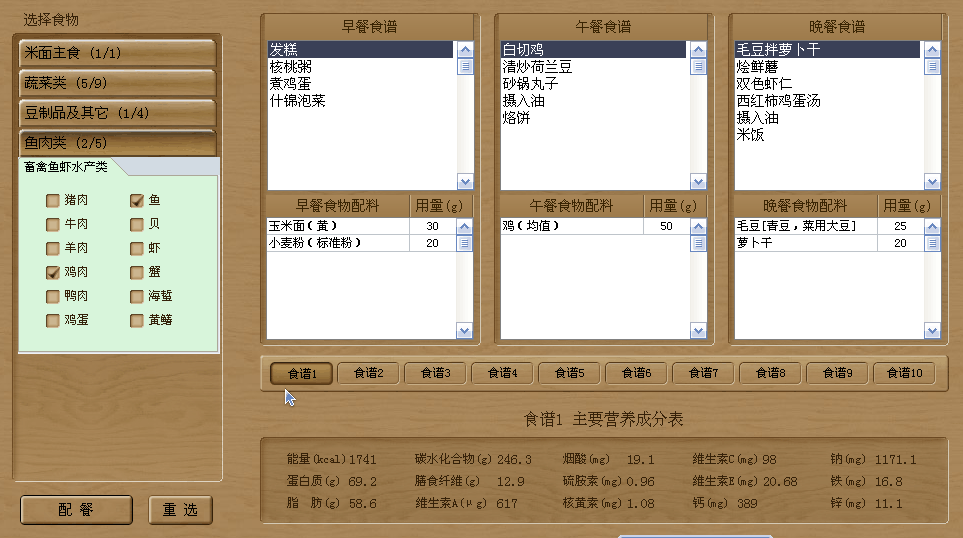 分别按早、午、晚三餐显示食谱,点击[食谱1]、[食谱2]、[食谱3]....点击这些按钮可以看到不同的配餐,在窗口下面还显示全日营养素含量呐。